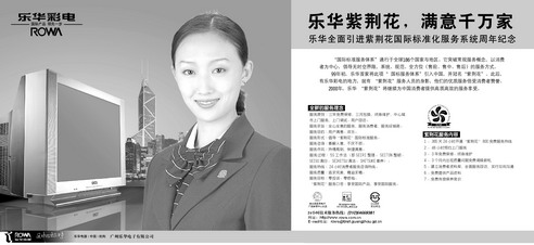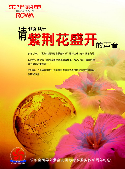 不过乐华并没有随着其他品牌的大流,泛泛地宣称自己的服务水准与承诺,而是首先想到了自己“国际产品”的定位,度量怎样才可以在服务宣传上也形成差异化,利于品牌建设。一个可行的想法是,既然乐华彩电是国际产品,它的服务也应该是国际化的,不仅跟得上先进国家的高标准要求,而且要更加规范与体系化,确保服务品质。于是乐华着手完善了自己的服务系统,并根据长城电子“香港国际企业”的背景,以香港市花命名,开始在中国市场推行“紫荆花国际标准服务体系”。跟随的服务宣传运动,自然依此题材展开。 最终的结果,乐华的广告在名目繁多的服务广告中独树一帜,很好的回应市场,配合了短期的销售工作。更有意义的是,它再一次有效地加强了品牌“国际产品”的定位建立。