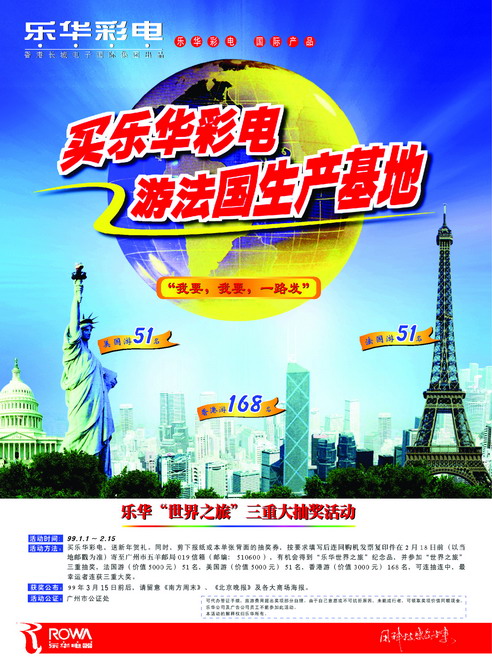 这种促销活动设计的好处,不止于奖品富有新意,能吸引人,还在于它即时而具体地让人感知到了乐华彩电的国际化形象,极具说服力,可以在销售现场就打动一些顾客。