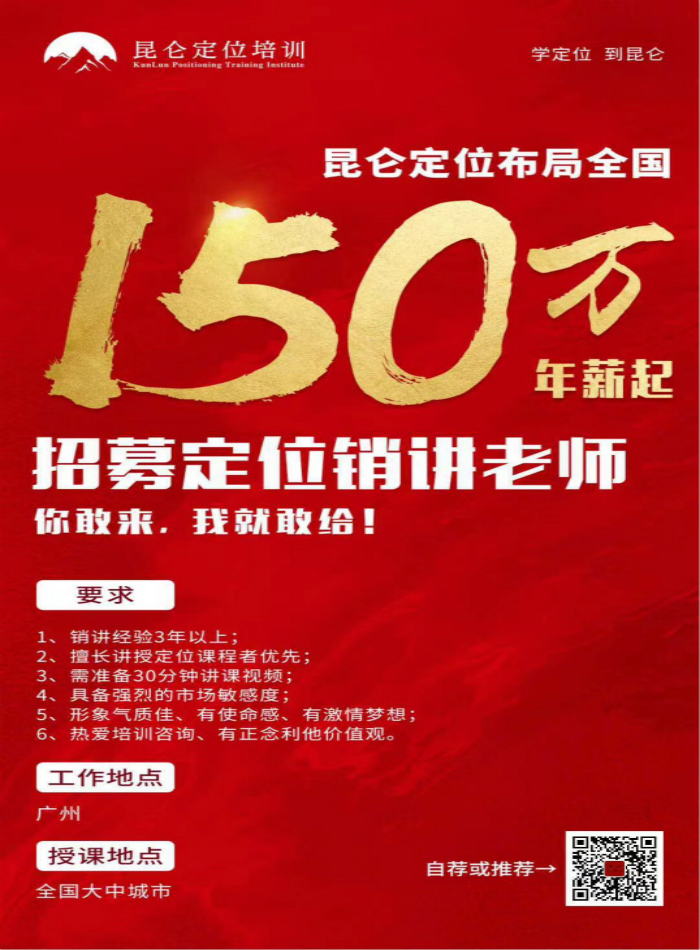 昆仑战略定位培训,成美旗下的专业定位公司,自2019年8月成立以来,注重教学质量,不注重教学规模,规模反而获得了高速增长,现面向全国招聘定位老师,同时将成立昆仑研究院,将由成美的研究总监担任教员,对昆仑定位培训招聘的老师们进行进一步的定位专业培训。