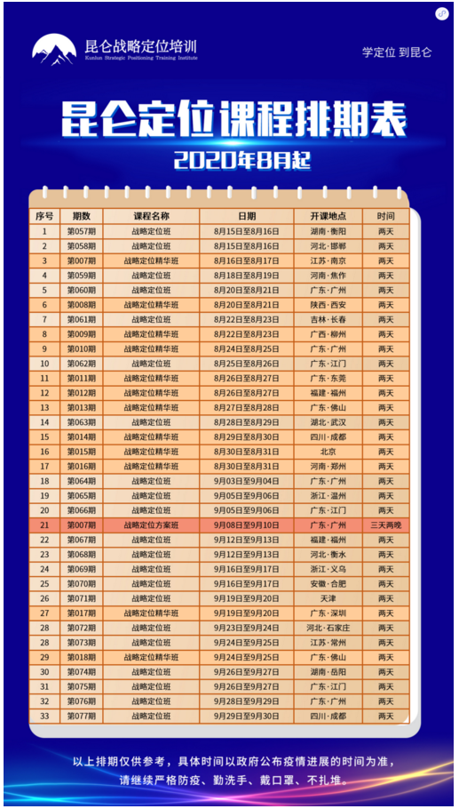 昆仑战略定位培训是成美旗下的专业定位培训公司,19年8月成立,短短一年,参加培训的学员人数已超过10000人,已成为中国领先的战略定位培训机构。